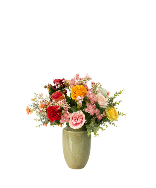 Dit boeket kenmerkt zich door de prachtig gekleurde rozen. Tussendoor vind je groen blad en besjes terug. Dit volle boeket behoudt het hele jaar door zijn prachtige kleuren en heeft geen water nodig. Hierdoor geniet je het gehele jaar door van een kleurrijk bloemstuk in je interieur.